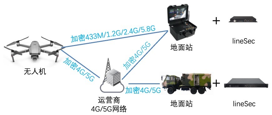 采用lineSec方案:無人機飛控板快速集成lineSec核心板,實現控制數據&圖傳數據透明鏈路加密,無需更改飛控數據協議;地面站可直接通過RJ45/串口等接口實現鏈路快速解密。實現無人機系統雙向身份認證以及網絡數據高強度加密保障。
